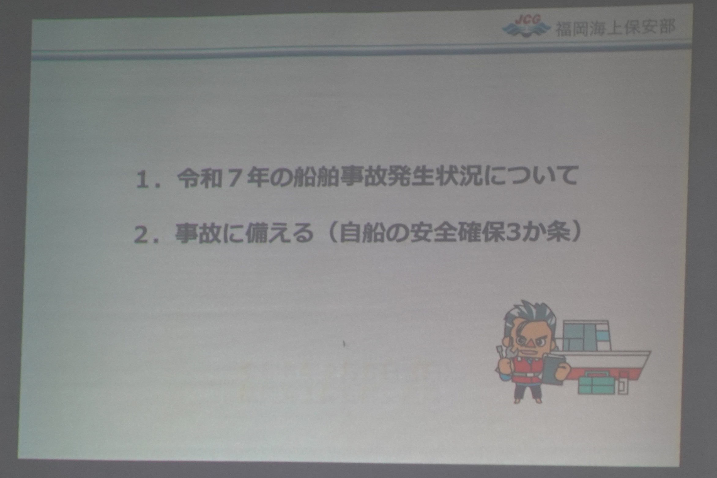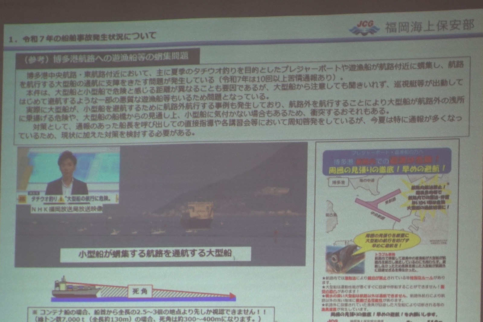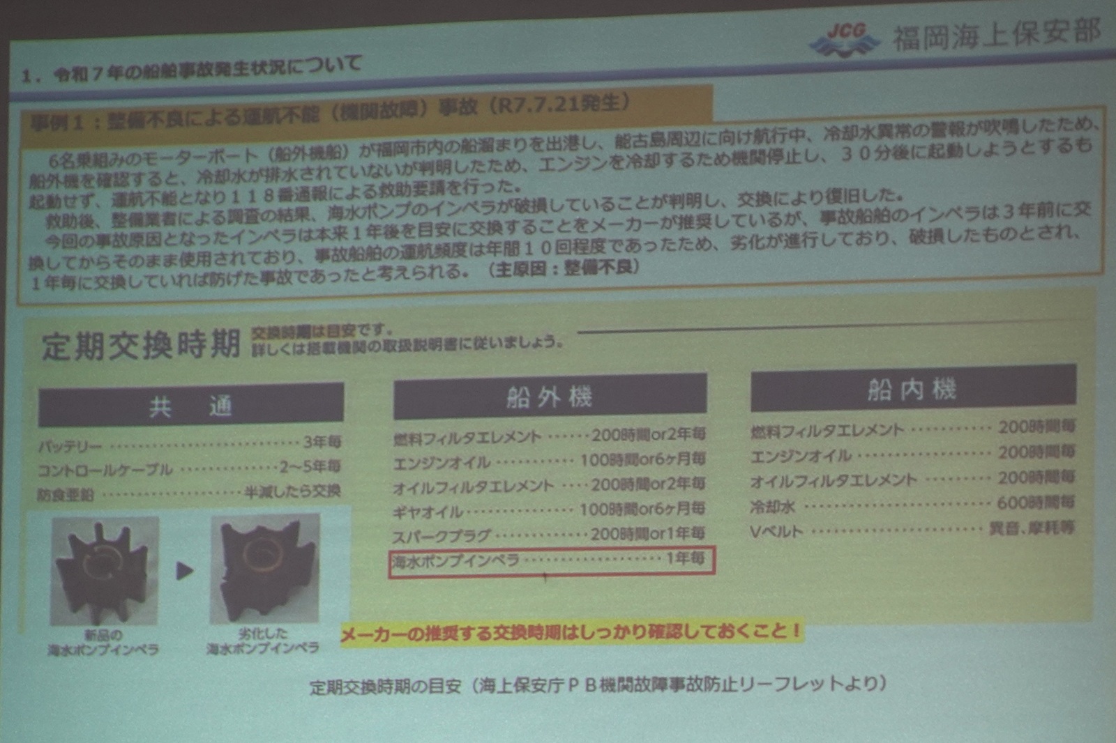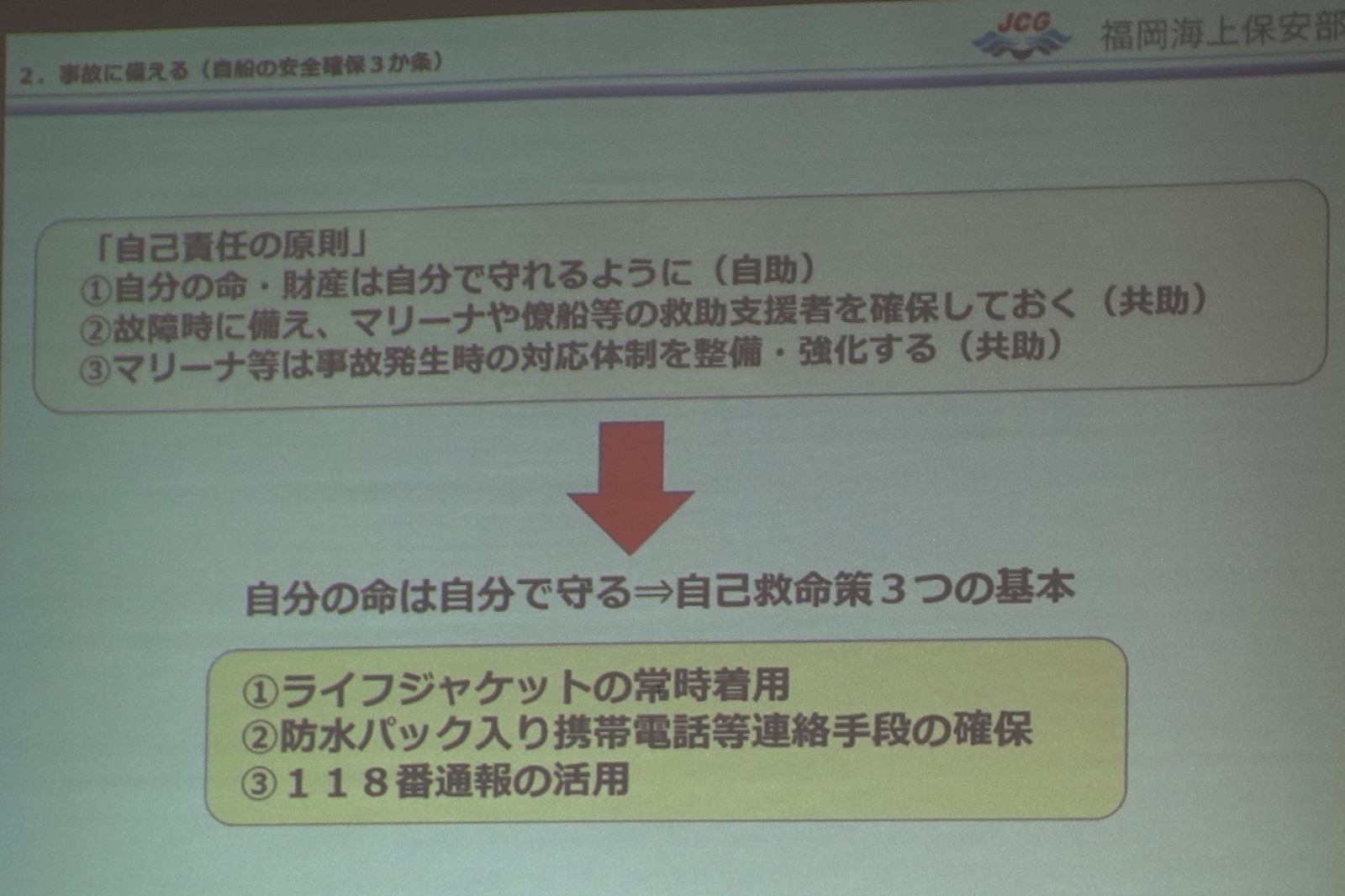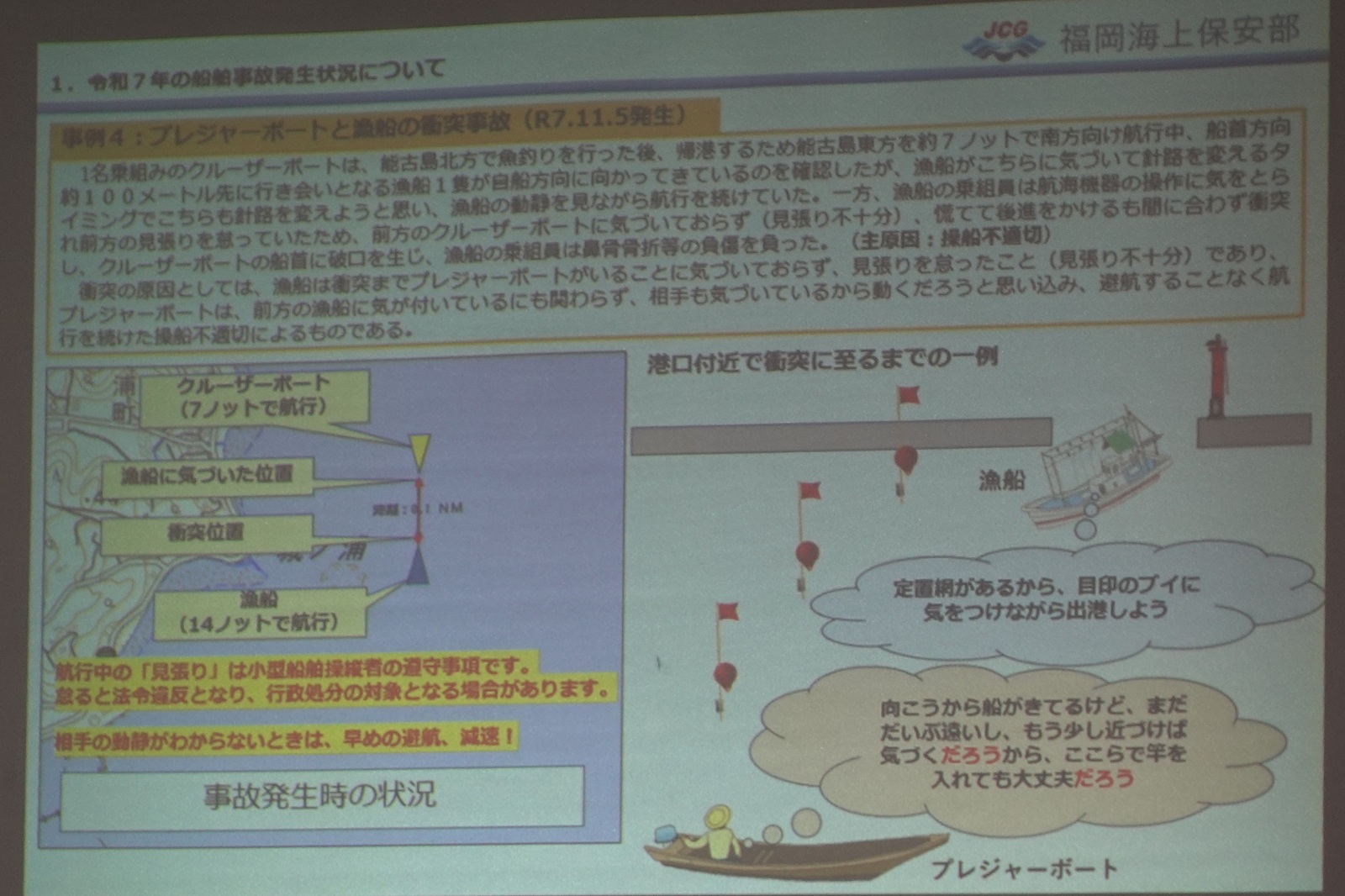 最初に主催のヨットハーバー管理事務所の挨拶の後、福岡海上保安部交通課から福岡海上保安部管内の令和7年の船舶海難事故発生状況と衝突事故の実例紹介がありました。プレジャーボートの事故は4月から10月に多く発生していて、船舶事故の発生位置は志賀島周辺、宗像の相島・地島周辺、糸島半島周辺が多いとのこと。また、経験年数10年以上のベテラン者の事故が多いとのことでした。最後に、事故に備えるために、海上保安部の海の情報コンテンツの利用、小型船舶との衝突を防ぐ、エンジン外の部品の点検、救命胴衣の点検を行い、「自分の命は自分で守る」ことを一番に考えてとのことでした。