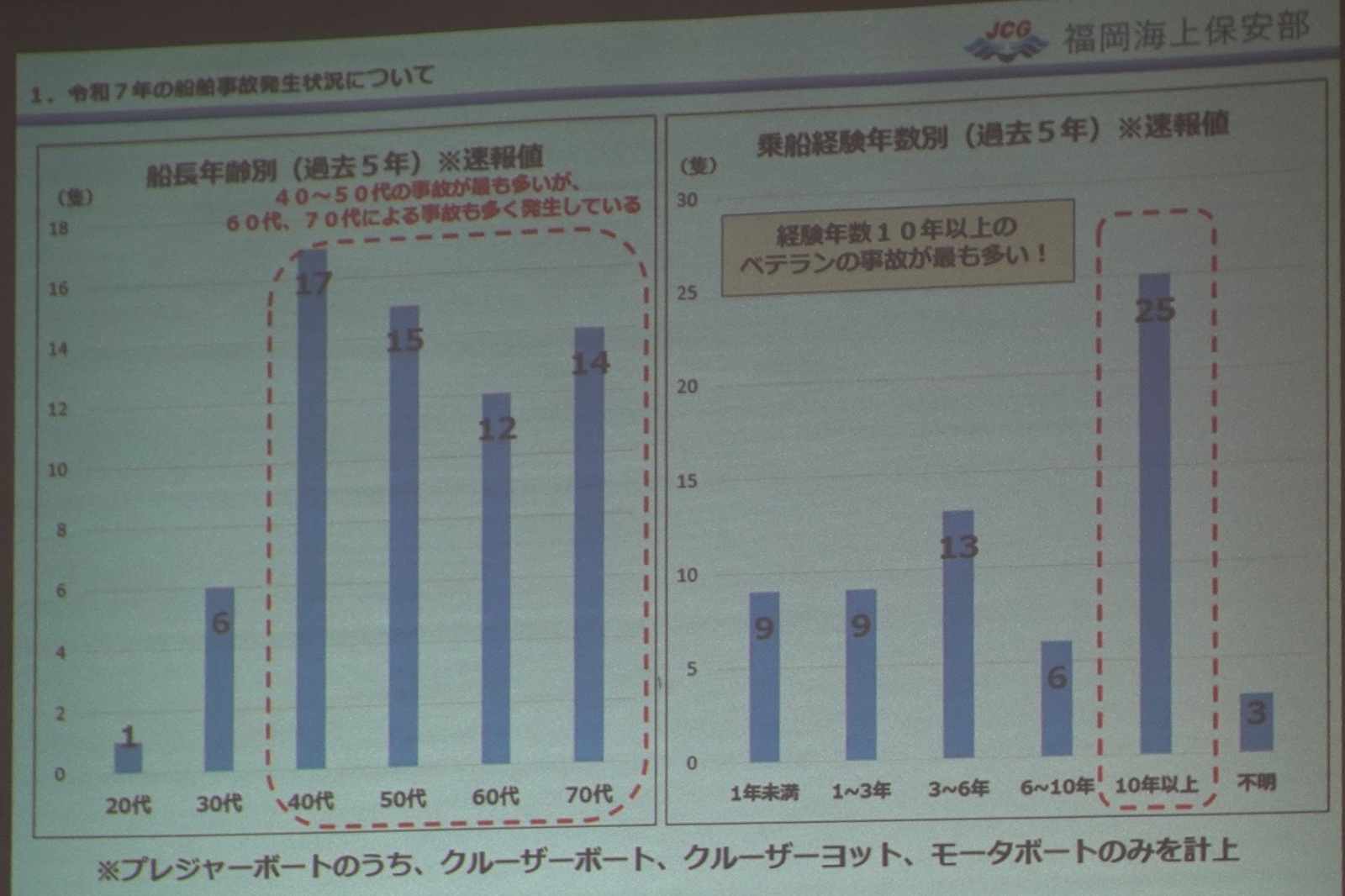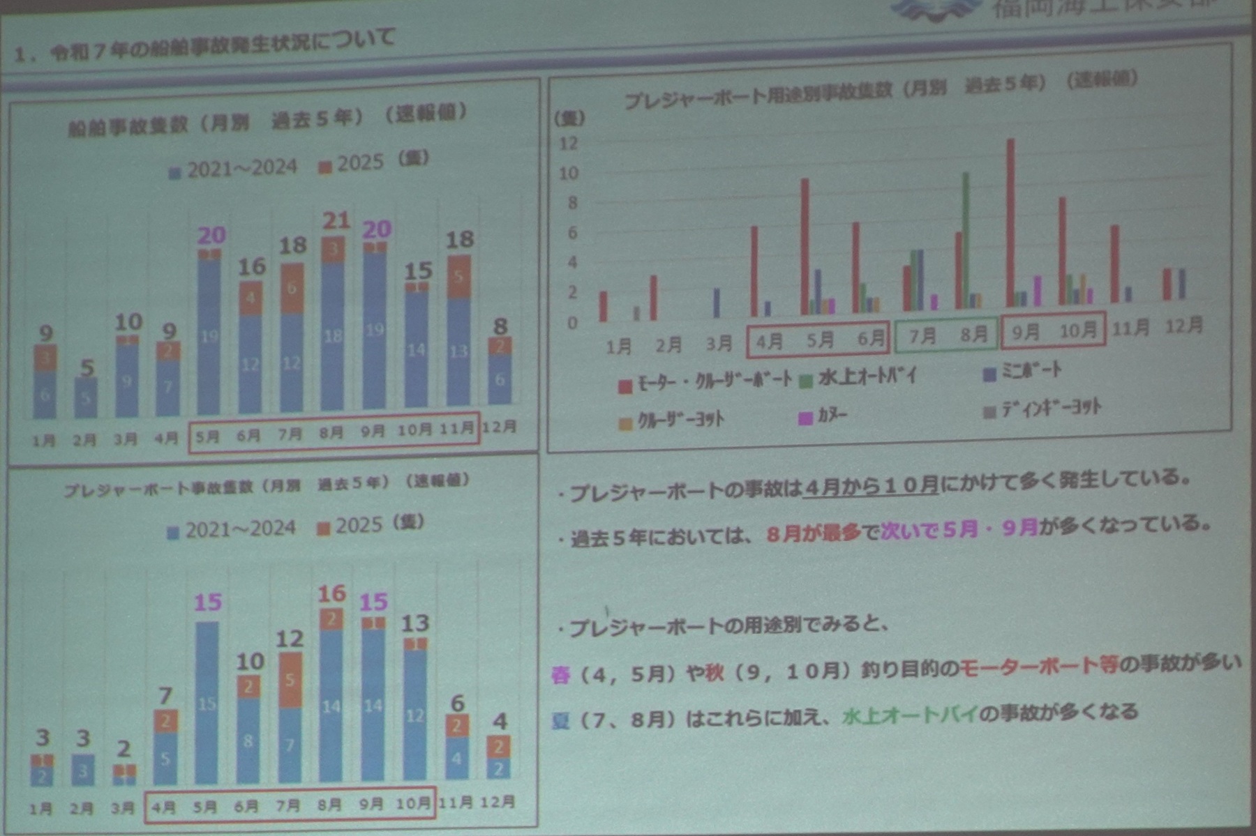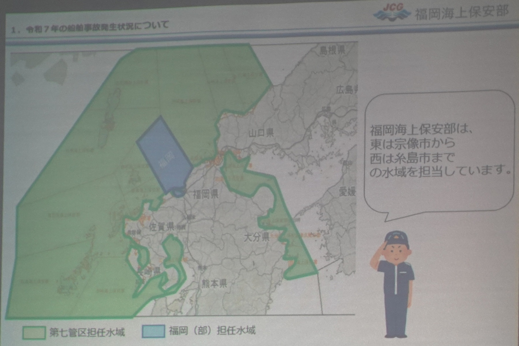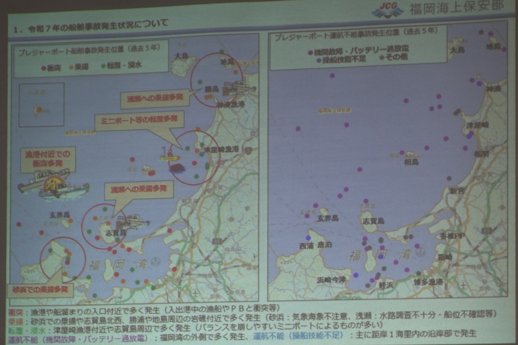 最初に主催のヨットハーバー管理事務所の挨拶の後、福岡海上保安部交通課から福岡海上保安部管内の令和7年の船舶海難事故発生状況と衝突事故の実例紹介がありました。プレジャーボートの事故は4月から10月に多く発生していて、船舶事故の発生位置は志賀島周辺、宗像の相島・地島周辺、糸島半島周辺が多いとのこと。また、経験年数10年以上のベテラン者の事故が多いとのことでした。最後に、事故に備えるために、海上保安部の海の情報コンテンツの利用、小型船舶との衝突を防ぐ、エンジン外の部品の点検、救命胴衣の点検を行い、「自分の命は自分で守る」ことを一番に考えてとのことでした。