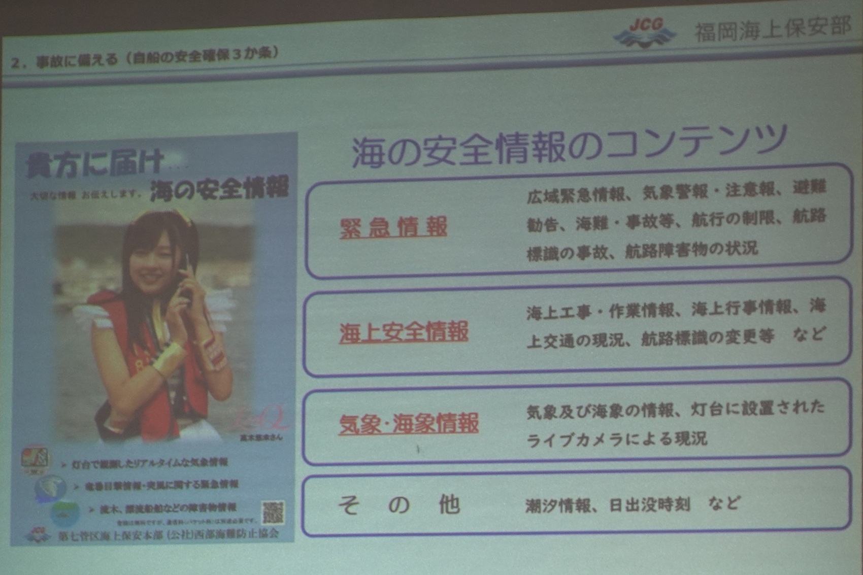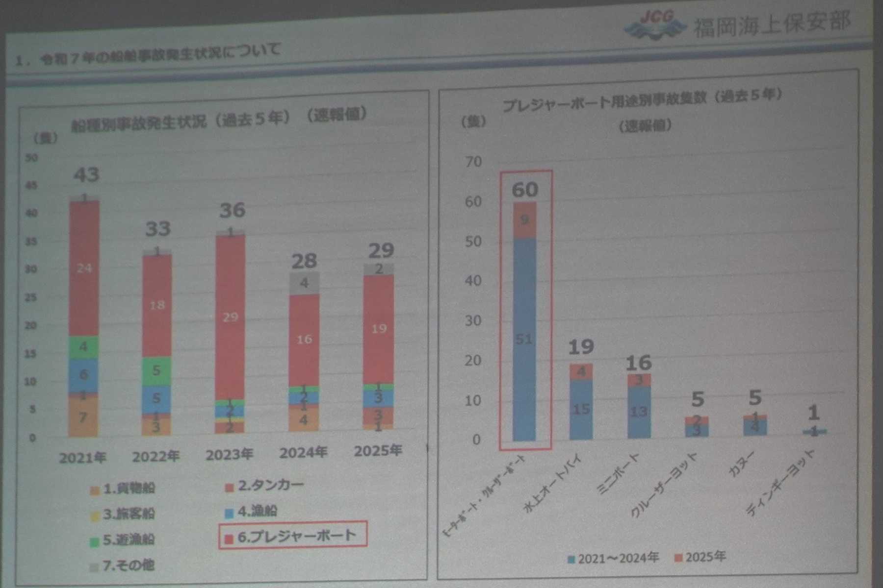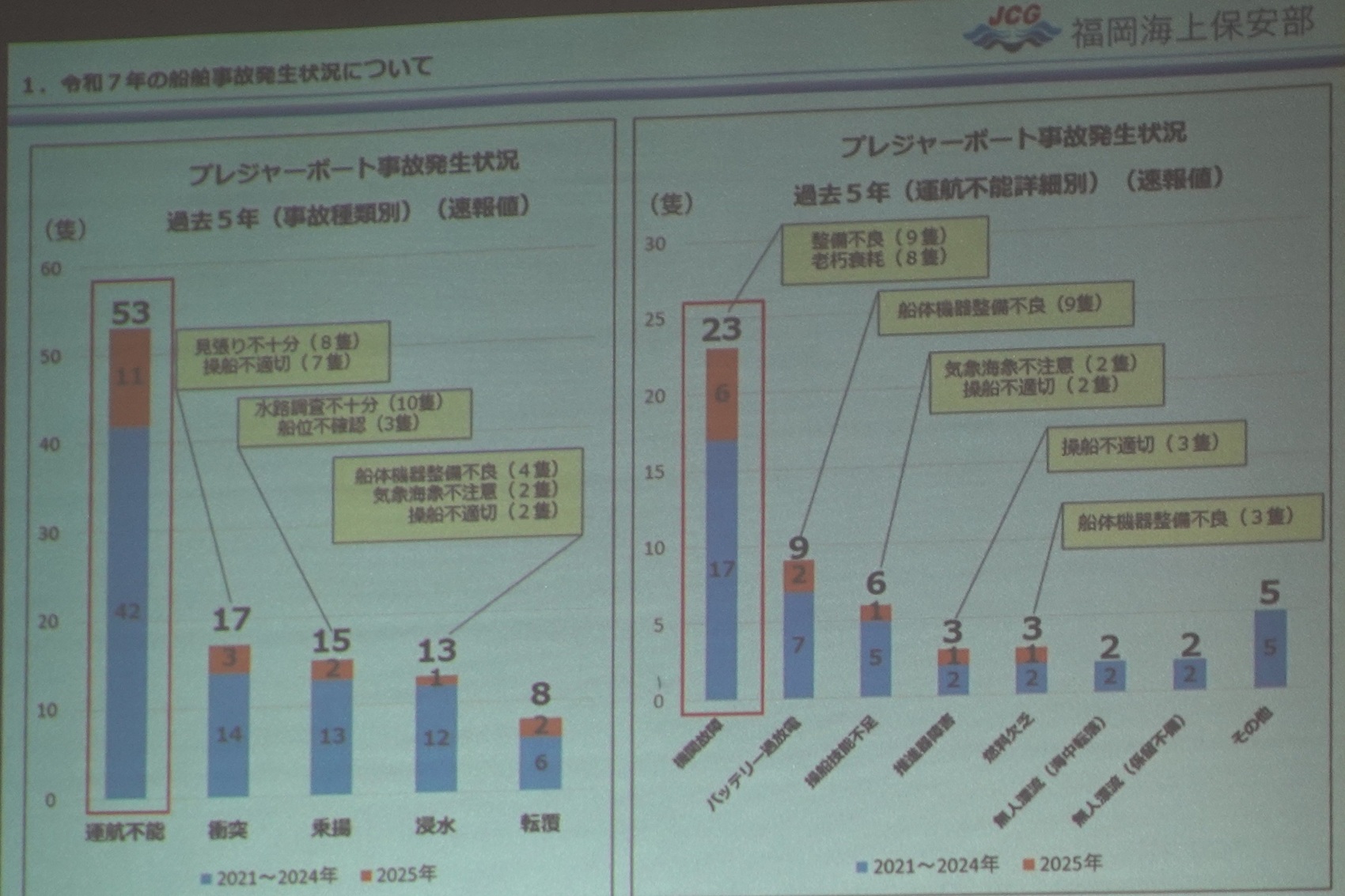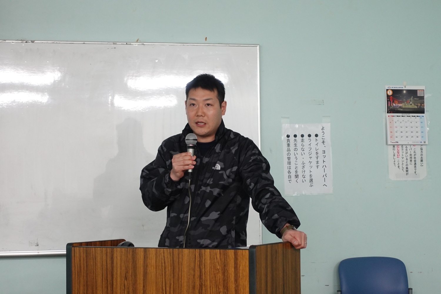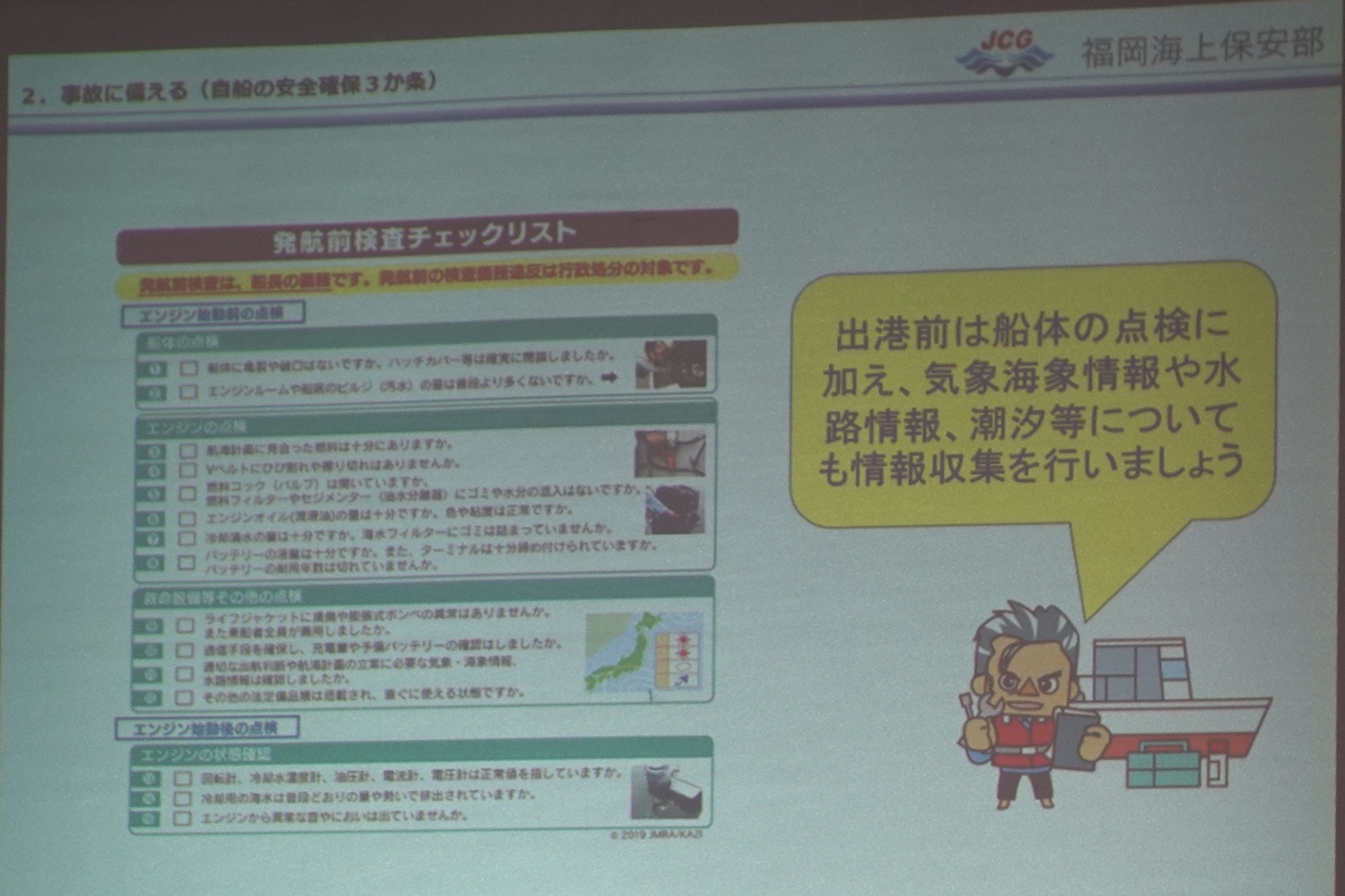 最初に主催のヨットハーバー管理事務所の挨拶の後、福岡海上保安部交通課から福岡海上保安部管内の令和7年の船舶海難事故発生状況と衝突事故の実例紹介がありました。プレジャーボートの事故は4月から10月に多く発生していて、船舶事故の発生位置は志賀島周辺、宗像の相島・地島周辺、糸島半島周辺が多いとのこと。また、経験年数10年以上のベテラン者の事故が多いとのことでした。最後に、事故に備えるために、海上保安部の海の情報コンテンツの利用、小型船舶との衝突を防ぐ、エンジン外の部品の点検、救命胴衣の点検を行い、「自分の命は自分で守る」ことを一番に考えてとのことでした。