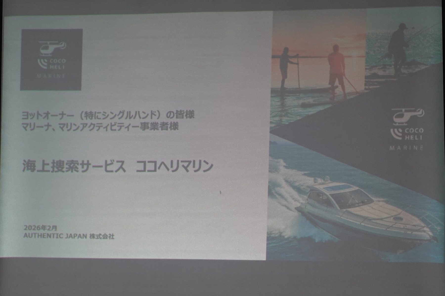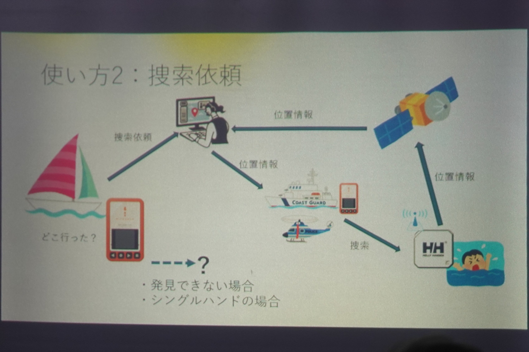 次に、オーセンティックジャパン㈱から、海上捜索サービス・ココヘリマリンの案内がありました。3つの電波を発する小型の発信機(防水仕様)を備えることにより、船の位置情報や万一落水した際に落水者の捜索支援サービスにより発見・救助の可能性が高まります。