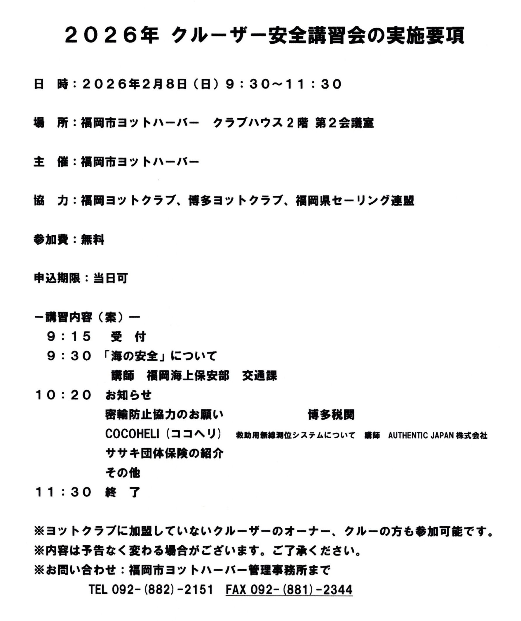 海では安全には細心の注意を払っても避けがたい突発的な状況に遭遇することがあります。いざというという時に適切な対応ができるか否かでダメージも大きく変わってきます。ヨットシーズン開幕前に、海での安全意識のさらなる徹底を図るためクルーザー安全講習会を開催します。ヨットクラブに加盟していないヨット愛好者の皆様も、この機会にぜひ受講されますようご案内します。